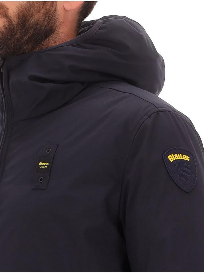 Ogni dettaglio è stato pensato per la funzionalità: il cappuccio fisso con bordo in lycra assicura una vestibilità perfetta, mentre la chiusura con zip reversibile permette un utilizzo semplice e immediato. Le pratiche tasche con zip su un lato e con bottone a pressione sull'altro offrono lo spazio necessario per i tuoi oggetti. Il patch e il passante con logo, presenti su entrambi i lati, confermano l'autenticità del brand Blauer.