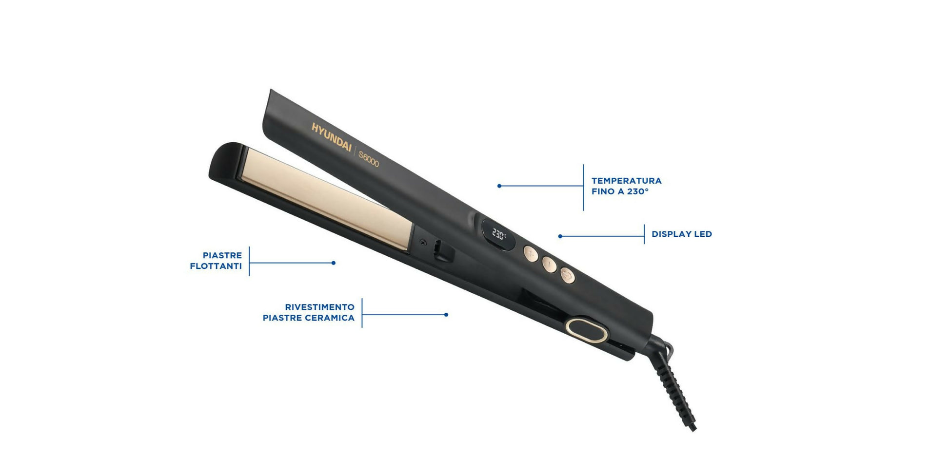 | PIASTRE FLOTTANTI PER UNA SCORREVOLEZZA FLUIDA E PERFETTA | DISPLAY LED DIGITALE CON INDICAZIONE PRECISA DELLA TEMPERATURA | TEMPERATURA DIGITALE: 150°, 170°, 190°, 210°, 230° | MANICO BLOCCABILE | CAVO GIRAVOLE A 360° CON ANELLO PER APPENDERE | Interruttore ON/OFF | Alimentazione 110-240 V / 50-60 Hz | |
